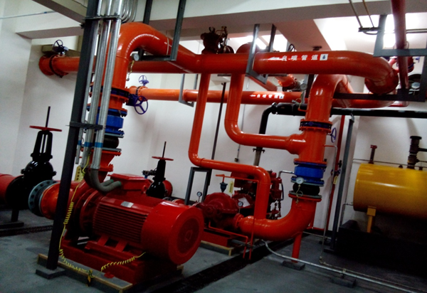 1)两个泵一用一备,检查其型号、流量、扬程、符合设计要求,品牌符合建设单位要求。按设计要求确定危险等级,喷头进场按GB50261-2016进行强度及温度试验,强度试验3 Mpa、温度试验70℃,1min内爆裂。喷头末端设防晃动吊架,末端泄水设压力表及阀门,泄水口应有排水措施(拖布池、台盆、地漏均可)。
