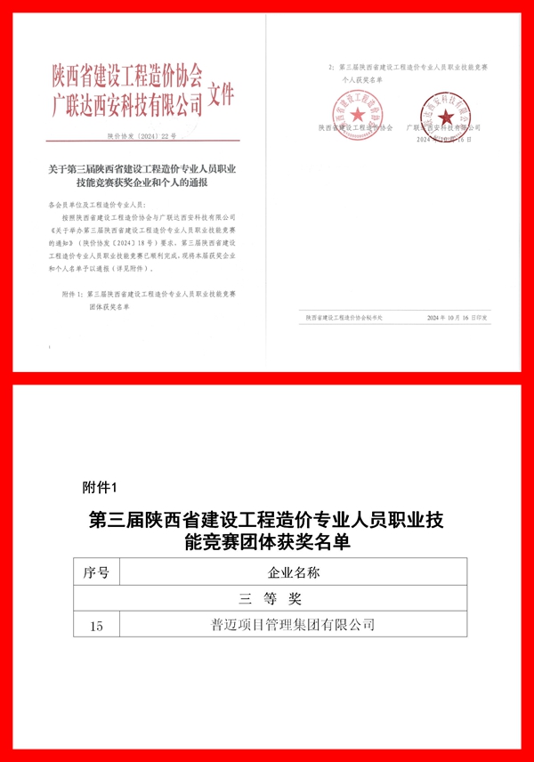 2024年10月17日,第三届陕西省工程造价专业人员技能竞赛获奖结果公布,杏彩杏彩(中国)荣获团体三等奖!