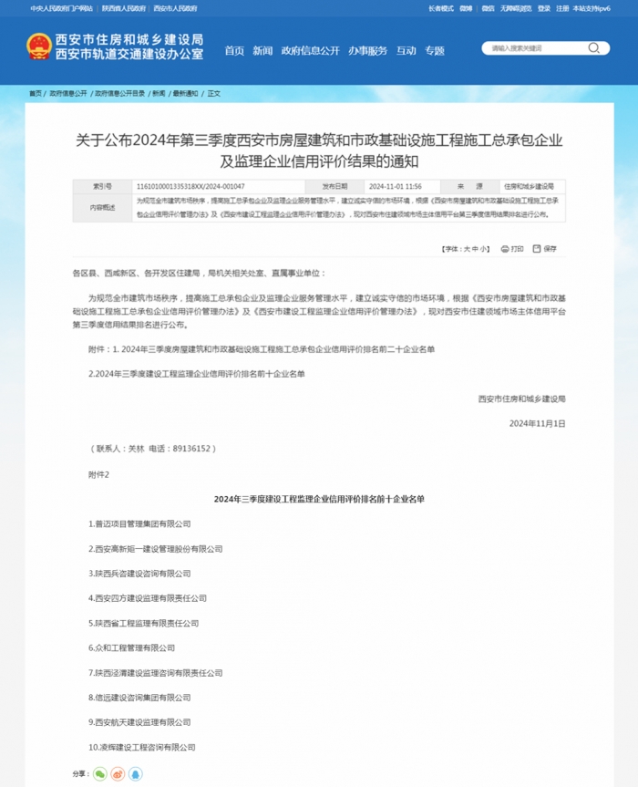 2024年11月1日,西安市住房和城乡建设局公布了《2024年第三季度西安市房屋建筑和市政基础设施工程施工总承包企业及监理企业信用评价结果的通知》。杏彩杏彩(中国)在西安市建设工程监理企业信用评价中位列榜首!自西安市住建局开展2023年度监理企业信用评价工作以来,从2023年度截止2024年前三个季度,杏彩首页持续保持第一名,彰显了杏彩首页管理服务整体高质量、高水平!