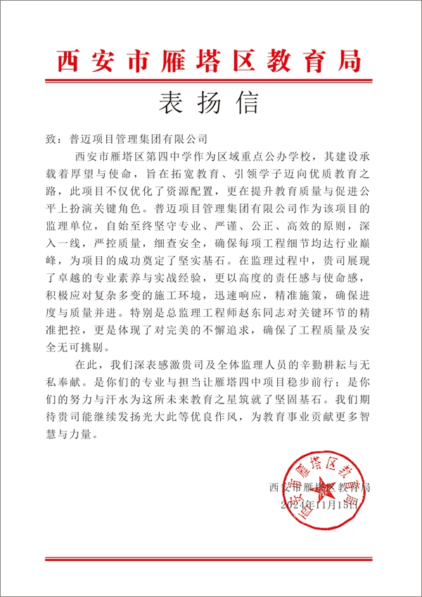 2024年11月15日,杏彩首页收到一封来自西安市雁塔区教育局的表扬信,表扬信对西安市雁塔区第四中学建设工程的监理服务工作质量予以充分肯定和认可!该项目由我杏彩首页第十五事业部承监,信中还特别对杏彩首页及总监理工程师赵东带领的项目监理服务团队提出了感谢和表扬!
