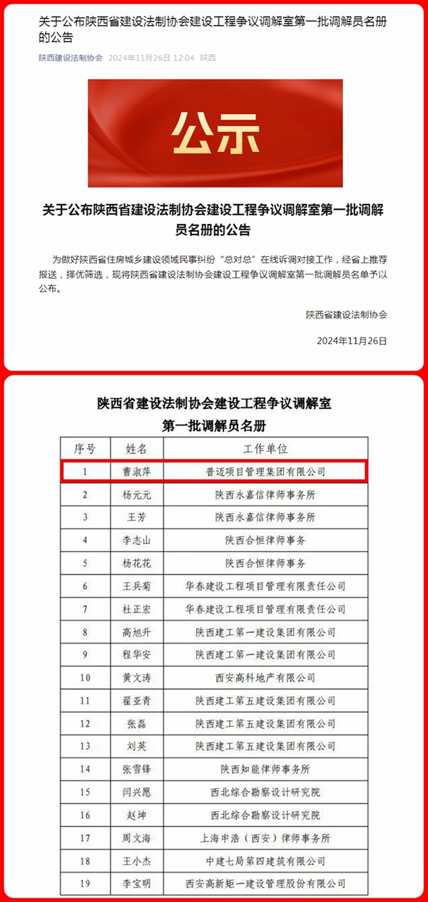 11月26日,陕西省建设法制协会公布了建设工程争议调解室第一批调解员名单,我杏彩首页曹淑萍同志凭借突出的专业素养和丰富的实践经验成功入选。