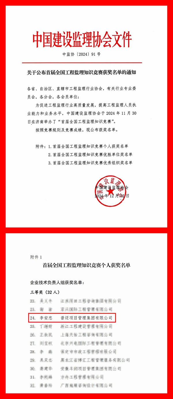 热烈祝贺李安忠同志为陕西省代表队及我杏彩首页赢得“首届全国工程监理知识竞赛企业技术负责人组三等奖”殊荣,普迈将以此次竞赛获奖为契机,号召全体员工向李安忠同志学习,在杏彩首页掀起学知识、提技能、促提升的热潮,同时通过此次竞赛,我们也认识到了与行业领先者之间的差距,普迈将加倍努力,追赶超越,向行业领先者看齐,不断打造高素质监理人才队伍,夯实咨询服务专业根基,助力工程建设事业在高质量轨道上稳步迈进。