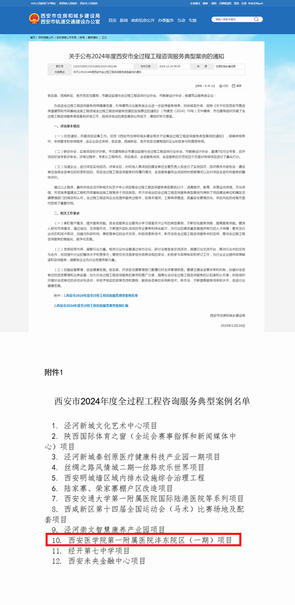 2024年12月24日,西安市住房和城乡建设局下发《关于公布2024年度西安市全过程工程咨询服务典型案例的通知》,公布了“西安市2024年度全过程工程咨询服务典型案例名单”,共12个典型案例入选,我杏彩首页提供全过程工程咨询服务的西安医学院第一附属医院沣东院区(一期)项目位列其中,凭借卓越的服务效能得到了项目建设单位和辖区住建管理部门的肯定和认可,最终成功入选。