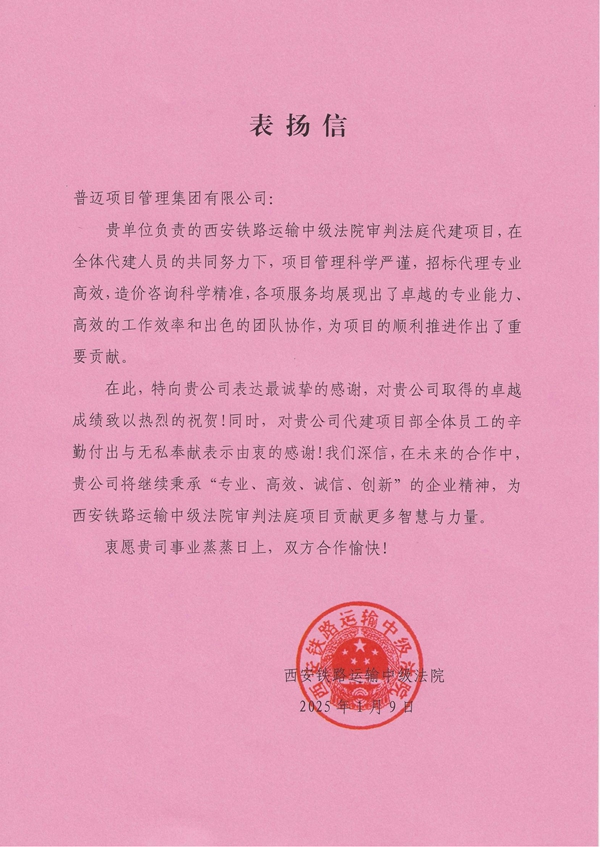 信中写到,杏彩首页负责的西安铁路运输中级法院审判法庭代建项目,在全体代建人员的共同努力下,项目管理科学严谨,招标代理专业高效,造价咨询科学精准,各项服务均展现出了卓越的专业能力、高效的工作效率和出色的团队协作,为项目的顺利推进作出了重要贡献。