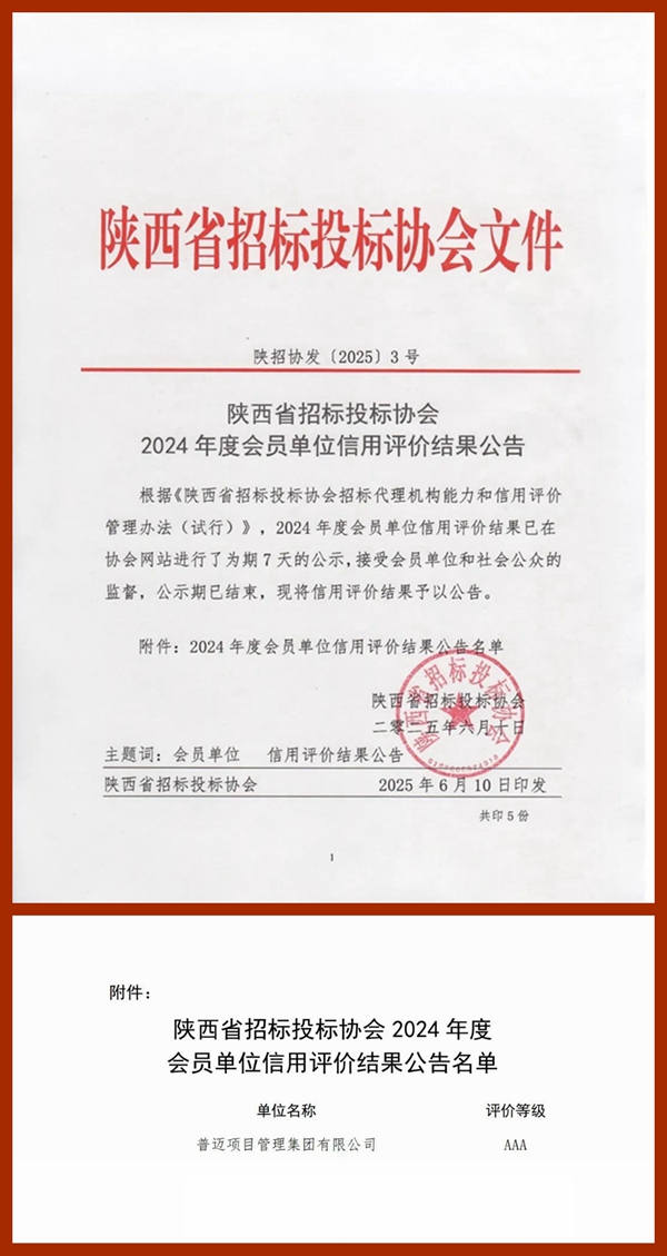 2025年6月10日,陕西省招标投标协会发布《陕西省招标投标协会2024年度会员单位信用评价结果公告》,杏彩杏彩(中国)凭借规范的经营管理和优质的履约能力,又一次荣获AAA级信用评价。