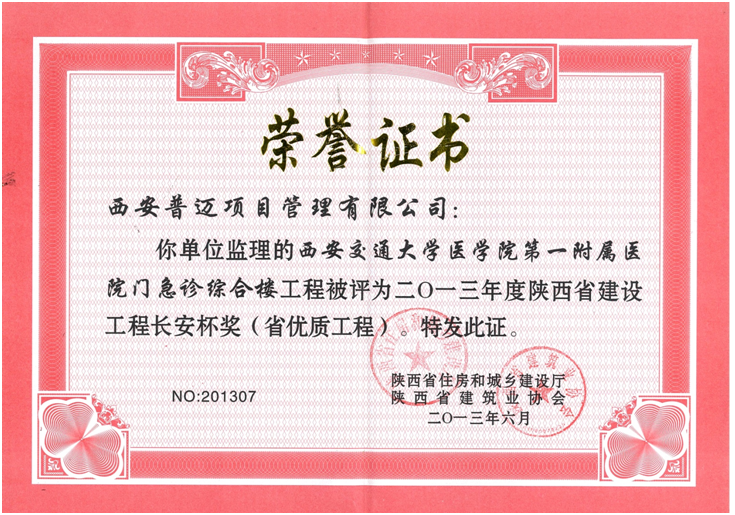 获得2013年度陕西省建设工程长安杯奖(省优质工程)