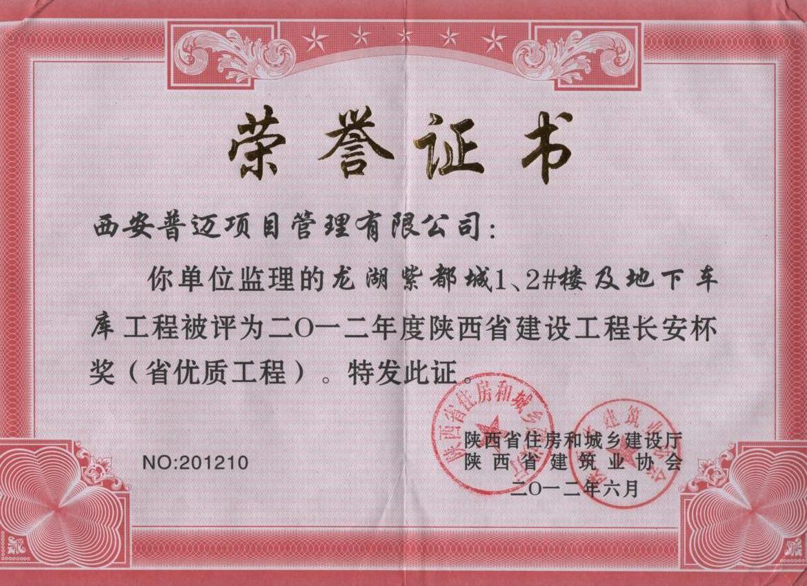 获得2012年度陕西省建设工程长安杯(省优质工程)